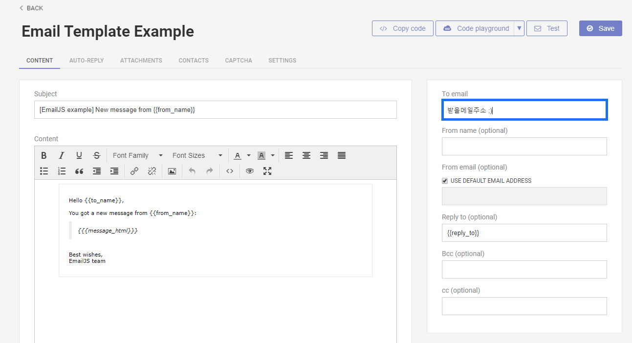 그럼 "Email Template Example"이 자동 생성되어 있다.