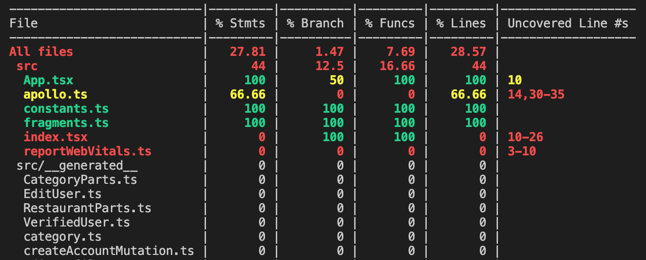 우선, npm test -- --coverage --watchAll로 내가 얼마나 코드를 테스트 했는지 현황을 볼 수 있다.