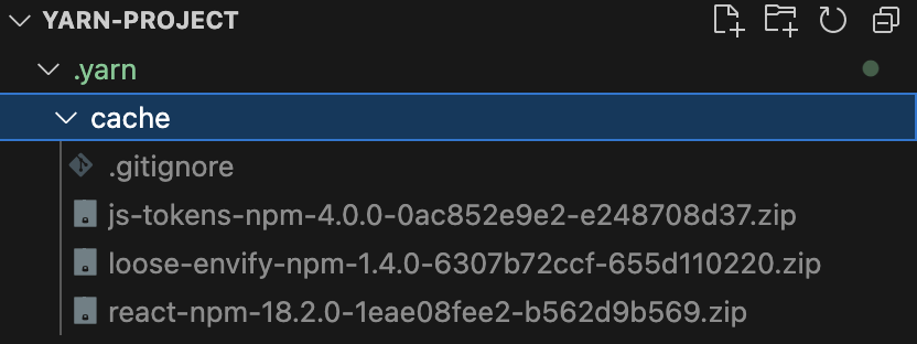 Yarn PnP에서는 zip 아카이브로 관리된다. 내가 설치한 react 18.2.0이 react-npm-18.2.0-1eae08fee2-b562d9b569.zip로 압축 되어 있는 것을 확인 할 수 있다.