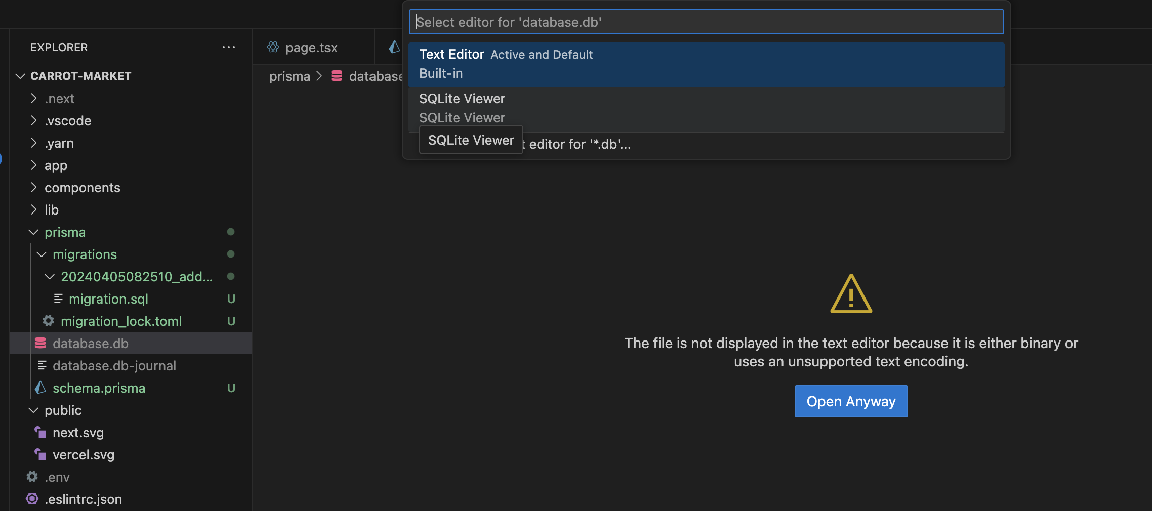 데이터베이스를 이용하기 위해 Prisma를 사용하기로 했고 필자는 우선 sqlite를 이용할 예정이다.