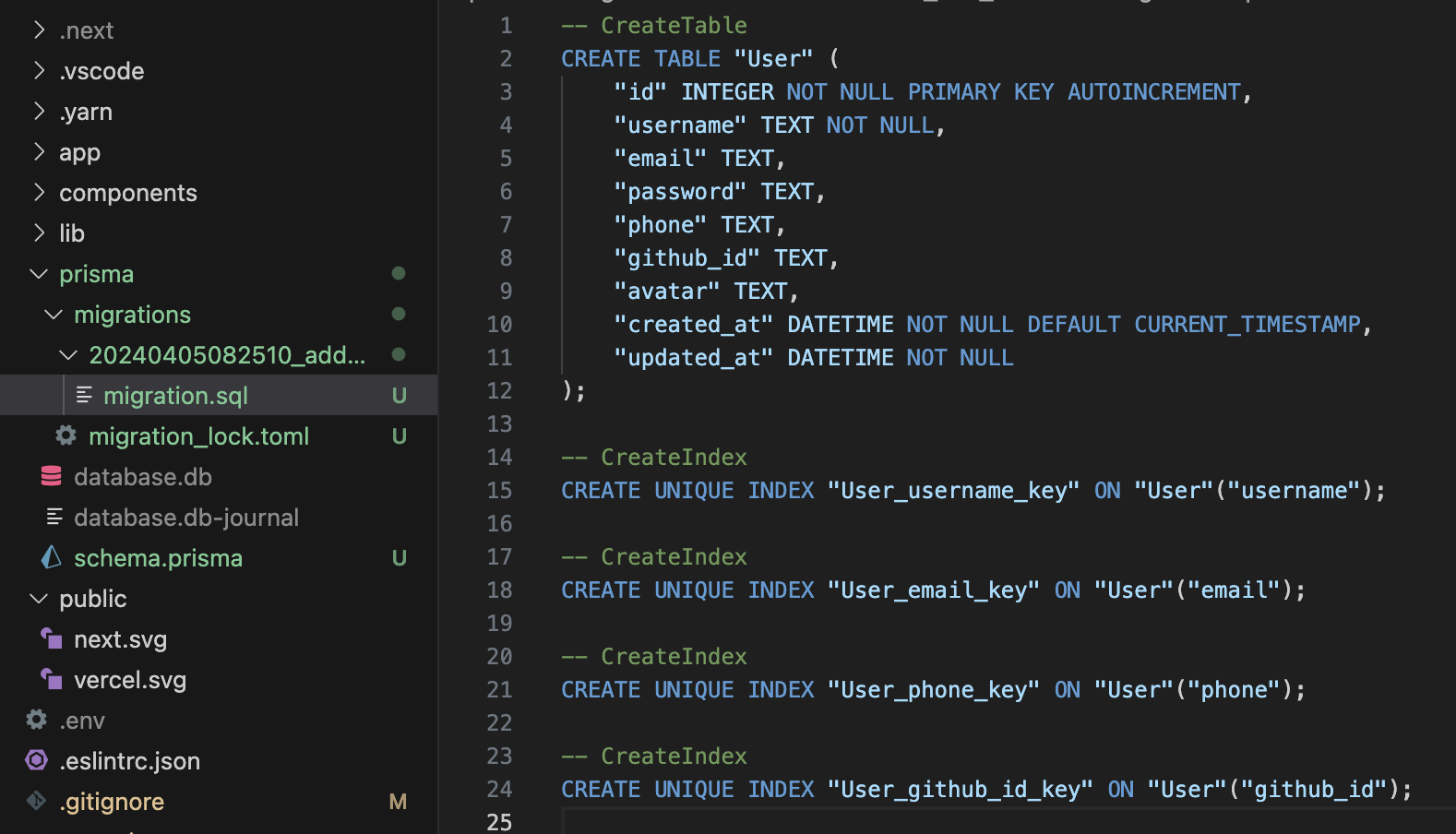 그다음 마이그레이션 명령어를 입력해주면 SQL문으로 변경된 것을 볼 수 있다!